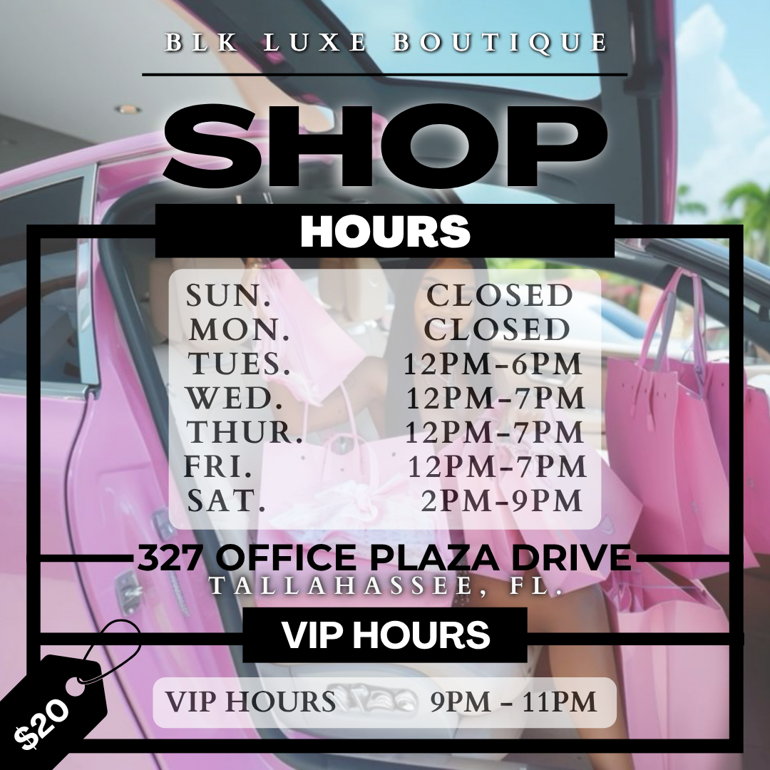 PSA: We are currently renovating our new physical location in Tallahassee, Florida. Until further notice, the physical location is closed but you may come order online and pick up within one hour of purchase. VIP Hours are on Saturdays ONLY and are an additional $20. Thank you for your support, happy shopping.