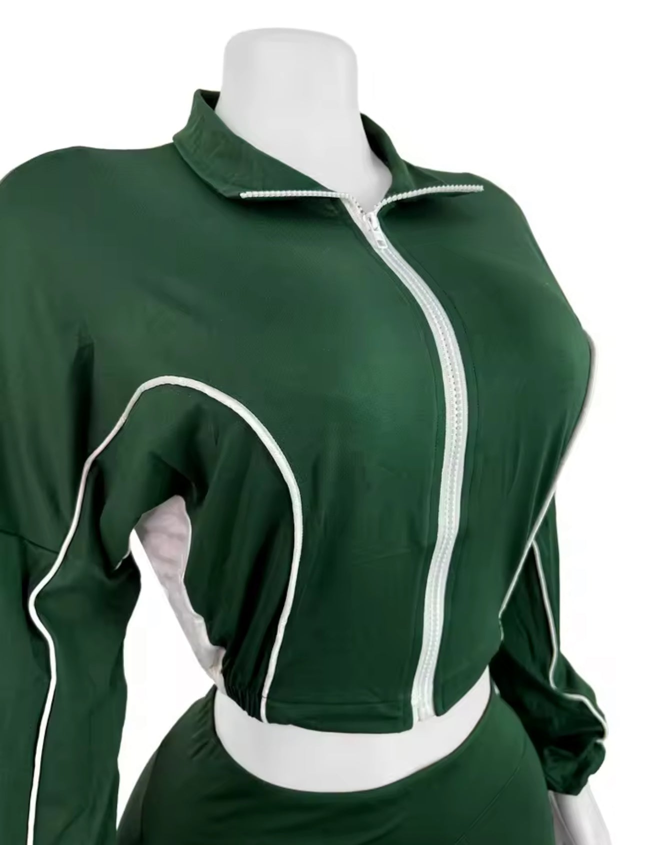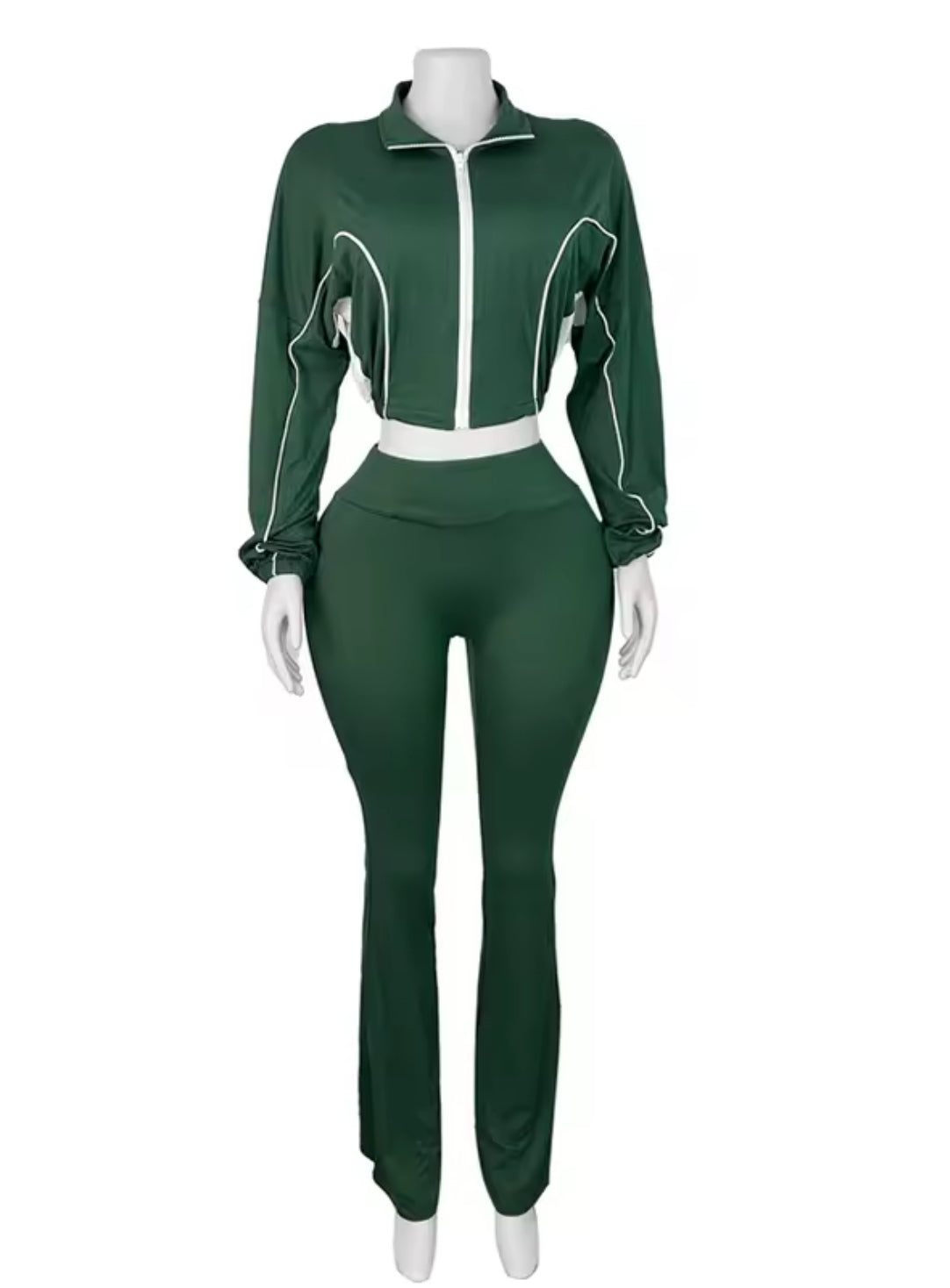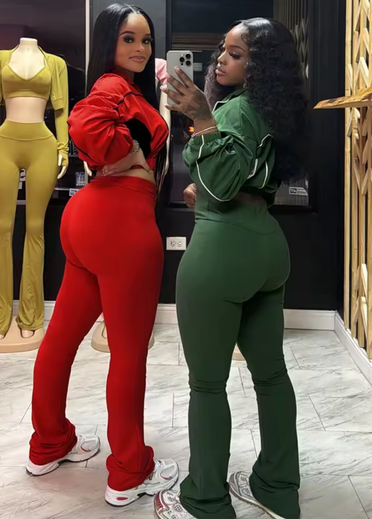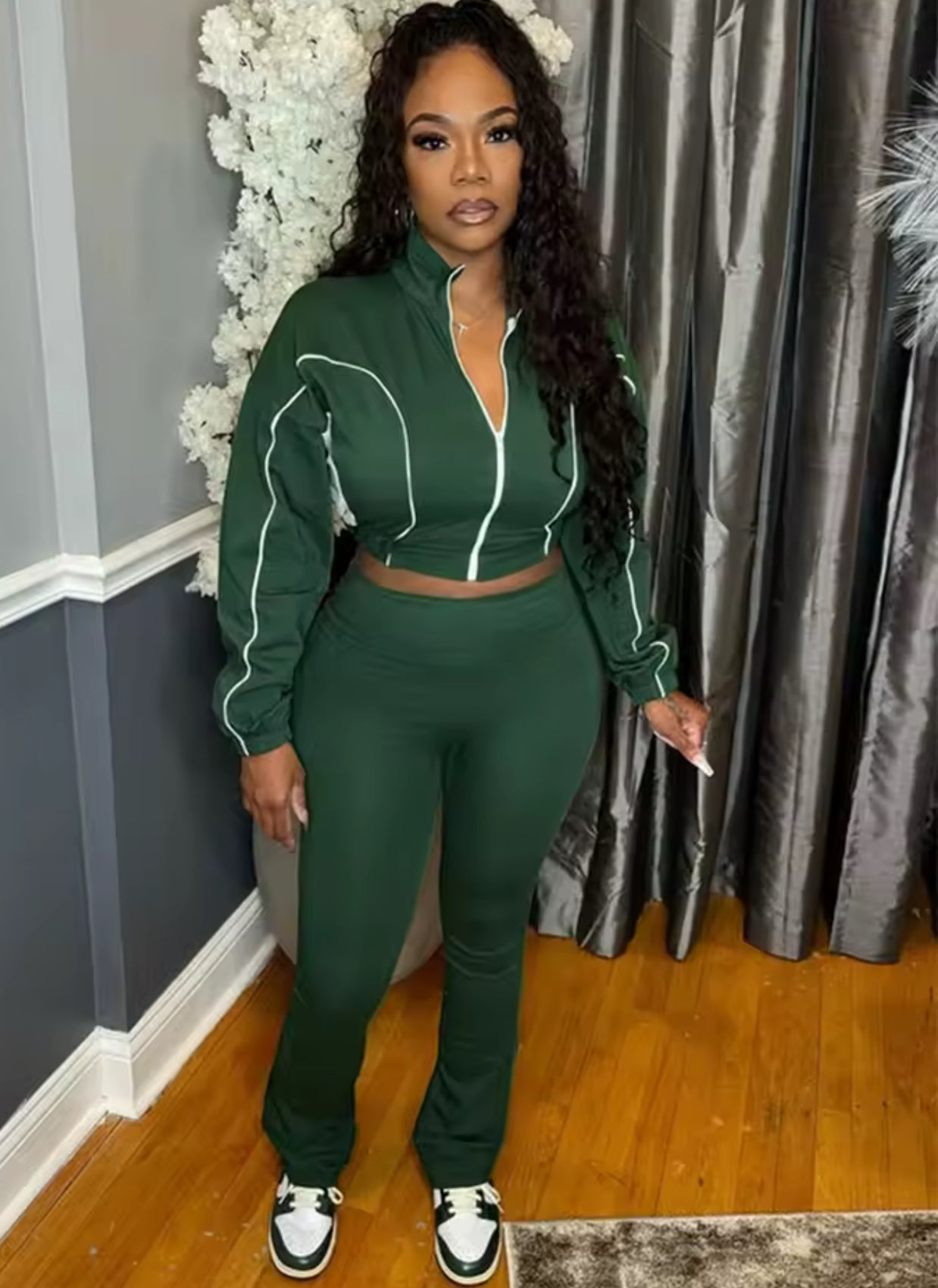 Discover our latest addition for your autumn wardrobe - a stylish 2-piece set designed for women. The set features a fashionable patchwork pattern and a full sleeve, zip-up jacket with an elastic hem, paired with flared pants. Perfect for FAMU homecoming events this season or casual activities, this set exudes a cool and trendy streetwear vibe.