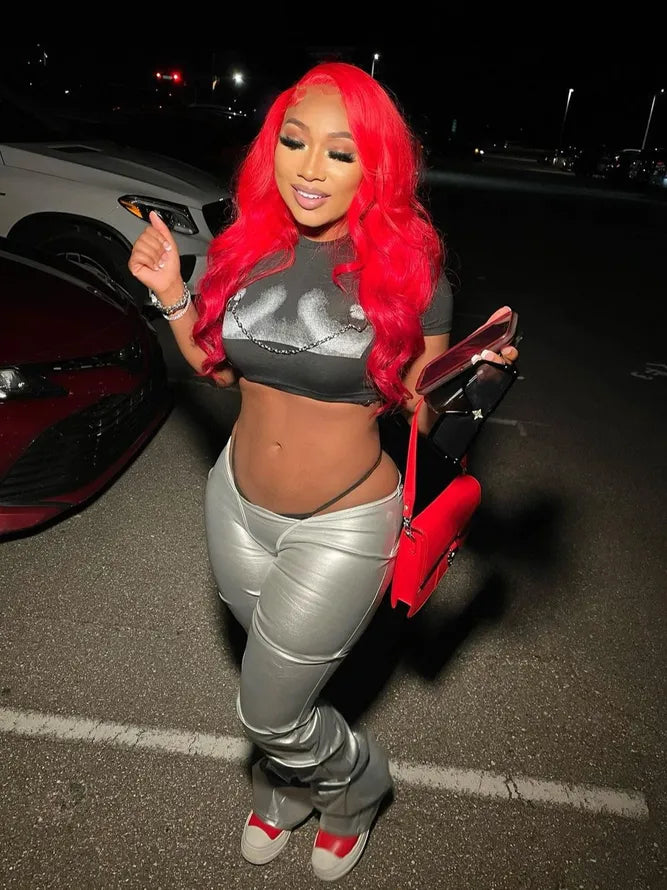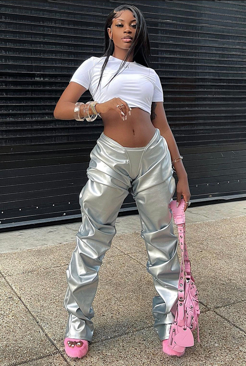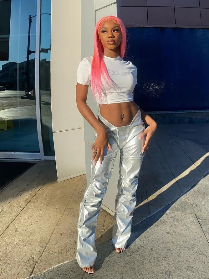 Metallic Silver Low Rise V-Cut Ruched Flare Pants