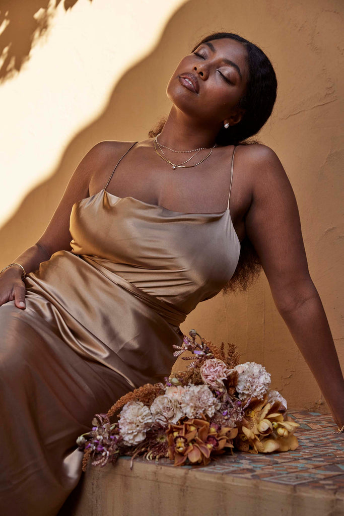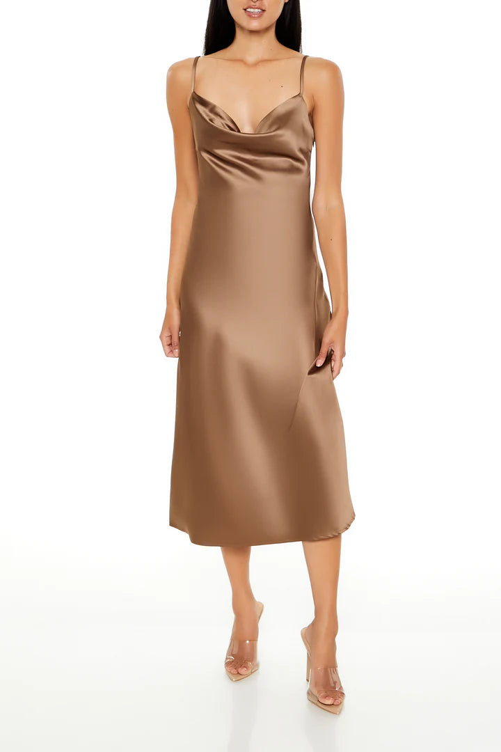 A plus size satin midi dress revealed a cowl-draped neckline evoking a clean and luxurious aesthetic for any special occasion.