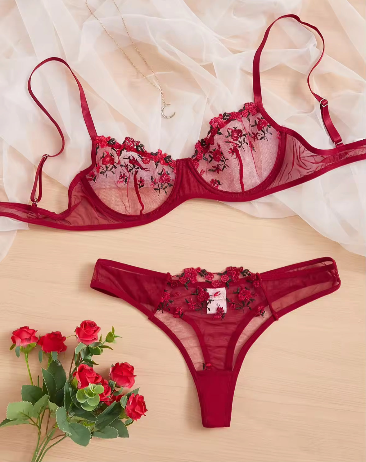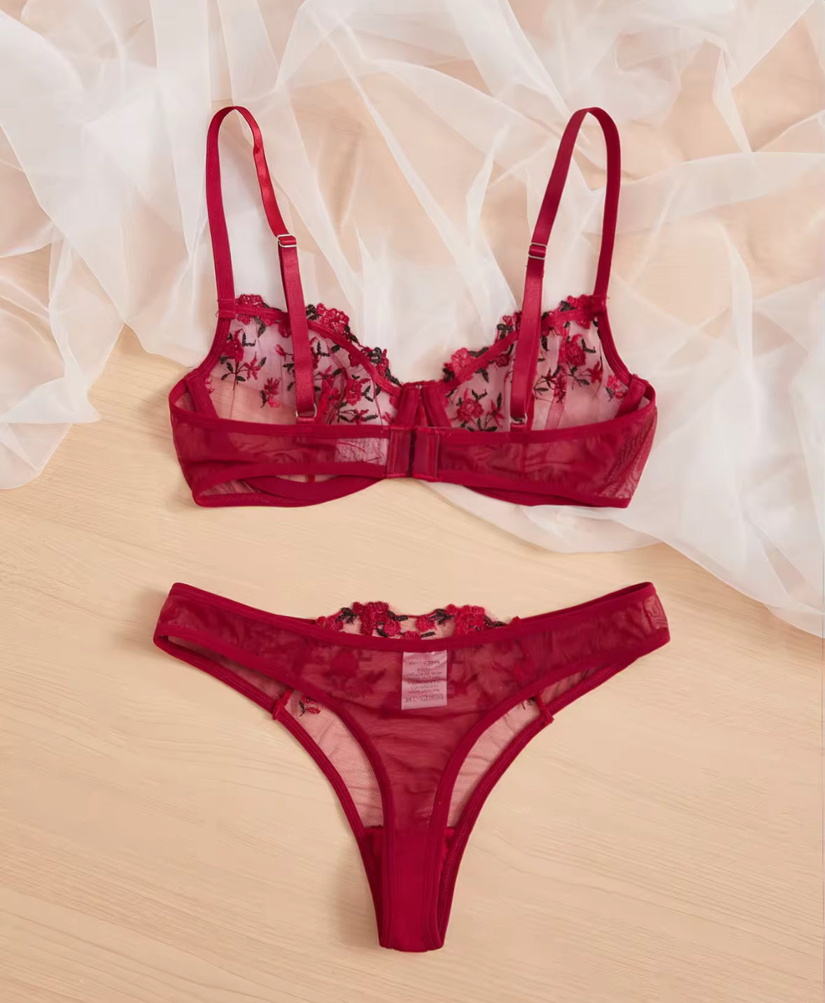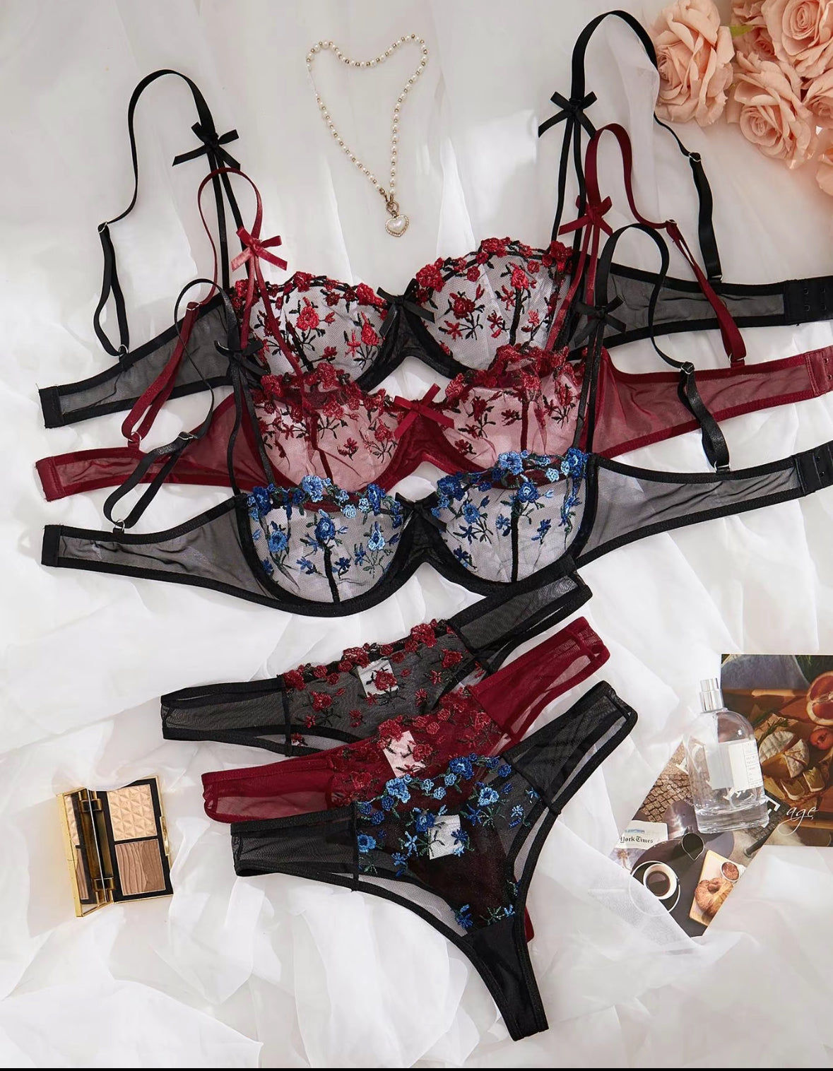 Embrace your figure with our Women's two-piece sheer lingerie set featuring delicate floral embroidery. Multiple colors available