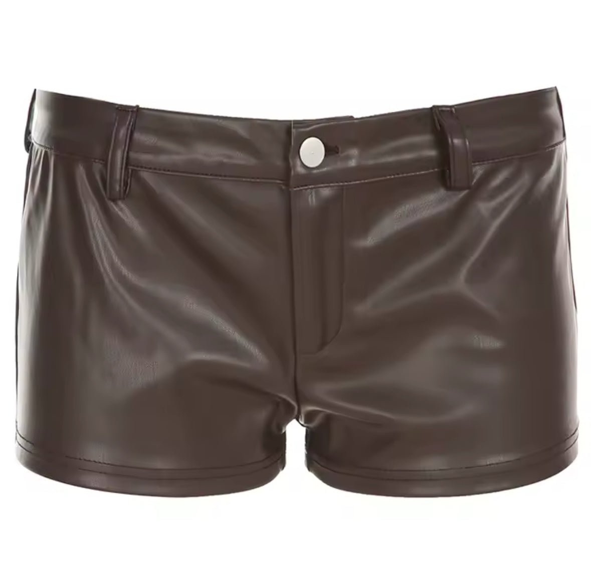 Explore our alluring lowrise short-shorts, available in CHOCOLATE FAUX LEATHER.